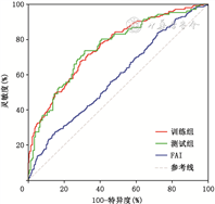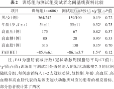 注:FAI为脂肪衰减指数(冠状动脉周围脂肪平均CT值);aχ²值;bt值;训练组与测试组是通过纳入的冠状动脉按7∶3的比例随机分组,每例患者纳入1~2支冠状动脉,故性别、年龄、高血压、高血糖和高血脂代表的是该支冠状动脉所对应的患者的相应指标,部分患者被计算了两次