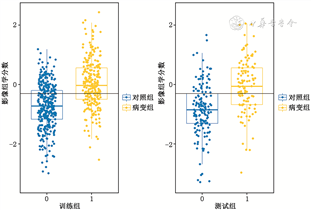 影像组学模型对于训练组和测试组患者的鉴别效能