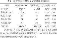 使用R软件(http://www.Rproject.org, 版本:3.5.1)进行统计分析。年龄、FAI值符合正态分布,以表示,采用独立样本t检验进行两组间比较。性别、高血压、高血脂、高血糖等定性资料采用率和频数描述,组间率的比较采用χ²检验。使用受试者工作特征(ROC)曲线评估模型的诊断效能。双侧检验,检验水准α=0.05。