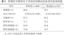 | 项目 | 训练组(n=606) | 测试组(n=259) |