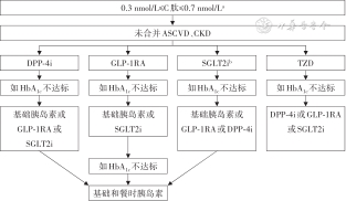 注:ASCVD为动脉粥样硬化性心血管疾病;CKD为慢性肾脏疾病;LADA为成人隐匿性自身免疫糖尿病;DPP-4i为二肽基肽酶-4抑制剂;GLP-1RA为胰高糖素样肽-1受体激动剂;SGLT2i为钠-葡萄糖共转运蛋白2抑制剂;TZD为噻唑烷二酮类降糖药;HbA1c为糖化血红蛋白;a与ADA/EASE指南中2型糖尿病血糖管理方案有所差异;b糖尿病酮症酸中毒风险增加,特别是在体质指数≤27 kg/m2的患者中