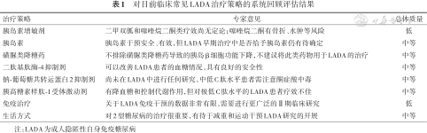 | 胰岛素 | 胰岛素干预安全、有效,但LADA早期治疗中是否给予胰岛素仍有待确定 | 中等 |