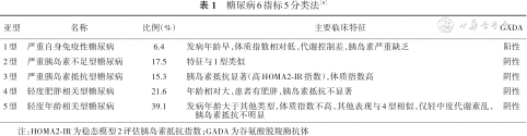 1.糖尿病6指标5分类法:瑞典隆德大学Leif Groop教授及其同事基于6个指标变量即谷氨酸脱羧酶抗体(glutamic acid decarboxylase antibodies,GADA),诊断年龄,体质指数,糖化血红蛋白,β细胞功能和胰岛素抵抗,使用聚类分析对新诊糖尿病患者进行分类,将患者分为五个亚型(表1)[8]。研究结果表明,这种新的成年型糖尿病患者分类法优于经典的糖尿病分类,它可以在诊断时识别出糖尿病并发症高风险患者,并提供有关潜在发病机制的信息,从而指导治疗。6指标5分类法一经问世,便引起糖尿病研究领域的极大关注。该分类法整合了易于获得的6项检测指标,探索了各个分型的差异化治疗方案,评估了不同类型糖尿病的并发症风险,是迈向糖尿病精准医疗的重要基础。