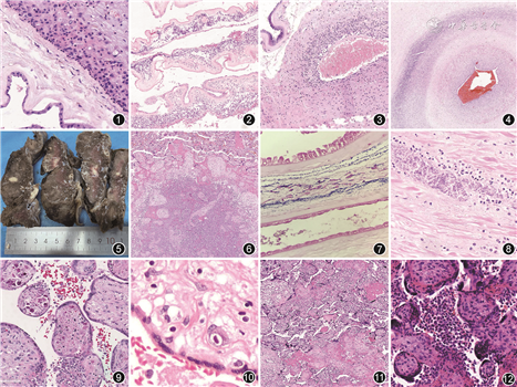 5.临床意义:急性感染是新生儿早发型败血症的危险因素之一,小于34周妊娠的可疑3I和肯定3I新生儿需要抗生素治疗,大于34周妊娠可疑3I的正常新生儿进行评估观察[16]。急性绒毛膜羊膜炎的分期与新生儿预后结局不完全一致,但2期以上的母体炎性反应和所有的胎儿炎性反应都需要加强临床关注和护理。炎性改变累及脐动脉时,新生儿脑瘫发病率升高[17, 18]。伴有绒毛膜羊膜炎经阴道分娩的产妇大约5%出现产褥期感染[19]。亚急性绒毛膜羊膜炎多见于念珠菌、解脲支原体感染,常在感染后2周出现,可引起新生儿慢性肺病,但很少导致急性呼吸窘迫的发生[20]。慢性绒毛膜羊膜炎是晚期自发性早产最常见的胎盘病变,在原因不明的死亡胎儿中比较常见[21]。Kim等[22]的研究表明,慢性胎盘炎性改变与极低出生体重儿的视网膜病变有关。