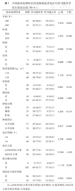 采用SPSS 22.0统计学软件进行分析,计数资料两组间比较采用χ2检验,采用logistic多因素回归分析化疗后肝功能异常的独立危险因素,P<0.05为差异有统计学意义。
