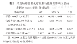 | 化疗方案(XELOX方案比mFOLFOX6方案) | 3.405 | 1.266~9.159 | 0.015 |