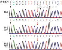诊疗经过:入院后初步诊断为腹胀原因待查(肠道发育畸形?低钾性肠麻痹?),休克,呼吸衰竭观察(Ⅱ型),重度脱水,电解质紊乱,血小板减少症,重度营养不良。患儿存在休克表现,给予积极扩容、抗休克、抗感染、禁食、胃肠减压、静脉营养等对症支持治疗。患儿呼吸急促无缓解,给予呼吸机辅助呼吸,多次复查立位腹X线片均可见肠管扩张并积气,存在多个气液平面。经治疗后,患儿腹胀仍进行性加重,呼吸困难无缓解,血乳酸进行性增高,提示出现腹腔高压综合征。入院后第5天急症行剖腹探查术及肠道减压术,并送检外周血进行全外显子组基因检测。外科术中见所有小肠、结肠广泛严重扩张,以横结肠扩张最为显著,肠壁增厚质韧,呈皮革状,未见肠蠕动,探查肠道未见机械性梗阻部位。给予回肠袢式造瘘,术中分别取乙状结肠、回肠、横结肠及阑尾送病理活检,术后返回重症监护室。肠道活检病理结果示乙状结肠、回肠肌层神经丛查见神经节细胞,数量不一,部分伴发育不良;横结肠肌层神经丛内查见少量神经节细胞,部分伴发育不良;阑尾纵行肌层外缘近浆膜处可见神经丛,查见神经节细胞,部分伴发育不良(图3)。根据病理结果,考虑暂不能排除先天性巨结肠同源病,该病目前无特殊治疗,以对症支持为主。患儿术后给予禁食、胃肠减压等处理,但腹胀缓解不明显,胃肠减压引流量始终较多,回肠造瘘口处引流量少,多次复查腹立位X线片仍可见肠管明显扩张并积气。入院后第20天全外显子组基因结果示ACTG2基因(OMIM: 102545)c.769C>T; p.Arg257Cys杂合突变,导致第257位的精氨酸被半胱氨酸所取代,美国医学遗传学与基因组学学会(American College of Medical Genetics and Genomics, ACMG)指南表明该突变具有致病性[1],可导致常染色体显性遗传疾病——内脏肌病(OMIM:155310),患儿父母ACTG2基因均未发现突变(图4),其兄体健,家长拒绝为其行基因检测。至此该患儿诊断明确,为ACTG2基因突变引起的内脏肌病,该病可引起慢性假性肠梗阻(chronic intestinal pseudo obstruction,CIPO)。家长放弃治疗,出院2个月后因病情加重死亡。