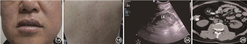 入院后检验结果,血常规:WBC:5.52×109/L,RBC:7.53×1012/L,Hb:146 g/L,PLT:297×109/L, 平均红细胞血红蛋白量(MCH)19.4 pg,平均红细胞体积(MCV)70.3 fL,红细胞平均血红蛋白浓度(MCHC) 276 g/L。EPO 253.38 mU/ml。血气分析正常。血管内皮生长因子(VEGF)357.7 μg/L(0~142 μg/L)。血β2微球蛋白:3.11 mg/L↑。免疫球蛋白G (IgG)49.3 g/L↑,轻链κ定量4 790 mg/dl↑,轻链λ定量178 mg/dl。血免疫固定电泳:在γ区可见一条单克隆IgGκ成分,单克隆免疫球蛋白(M蛋白)计算为31.75 g/L。尿免疫固定电泳、蛋白电泳阴性。骨髓细胞学检查:幼稚浆细胞4%,成熟浆细胞12%。骨髓病理:骨髓增生极度活跃,浆细胞比例升高(10%~20%),限制性表达kappa。骨髓流式:异常细胞群占有核细胞的2.97%,表达CD138、CD38、CD56、cKappa,不表达CD117、CD19、cLambda,为异常浆细胞表型。染色体核型正常。荧光原位杂交技术(FISH):RB-1基因缺失阳性,IgH基因重排阳性,CCND1/IGH阳性,TP53、1q21、1p32未见异常。二代测序:NOTCH2 Exon23 49.42%;NOTCH1 Exon21 48.29%。泌尿系B超:左肾体积增大,右肾体积正常,包膜规整,肾实质回声增强;皮质与髓质界限欠清。腹部CT:双肾形态、大小正常,边缘毛糙,左肾门上方水平紧邻肾皮质可见小低密度影,部分突出肾轮廓外(图2)。