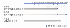 根据临床和科研需要,可分别选择单通道、双通道和多通道电极导管。单通道电极(即单纯食管pH值监测电极)一般用于监测远端食管的反流情况;在双通道电极中,一般1个电极用于监测食管远端反流情况,另1个电极则用于监测近端食管、咽喉部反流或胃内pH值的变化情况。