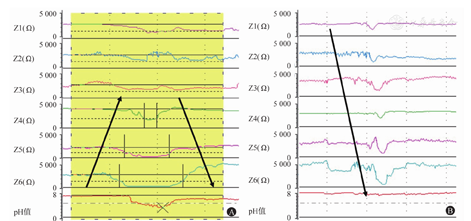 (1)反流事件的识别:反流事件需与吞咽事件进行鉴别。发生反流时,可观察到阻抗信号的改变是从远端通道至近端通道的逆行性变化(图3A)。发生吞咽时,从单个阻抗通道可观察到食团前方小团空气和通道接触导致阻抗值曲线短暂上升,随后食团通过使阻抗值曲线下降,食管蠕动导致阻抗值曲线短暂升高,随后恢复静息状态。纵行分析所有阻抗通道可发现近端通道的阻抗值首先出现变化,顺行性传递至远端通道(图3B)。