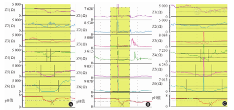 (2)反流物的性状:根据反流物的性状可将反流事件分为液体反流、气体反流和混合反流。液体反流指≥2个远端阻抗通道的阻抗值较基线阻抗值下降>50%,且持续时间≥4 s(图4A);气体反流指无吞咽动作时,≥2个远端通道的阻抗值快速上升>3 000 Ω(图4B);混合反流指同一个反流内同时混合有液体和气体反流,气体反流发生在液体反流期间或之前(图4C)。