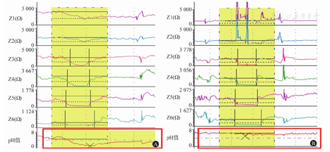 (3)反流物的pH值变化:MII-pH监测可以根据反流物的pH值将反流事件分为酸反流(pH值<4)和非酸反流(pH值≥4),其中非酸反流又可进一步分为弱酸反流(pH值为4~<7)和弱碱反流(pH值≥7)。见图5。