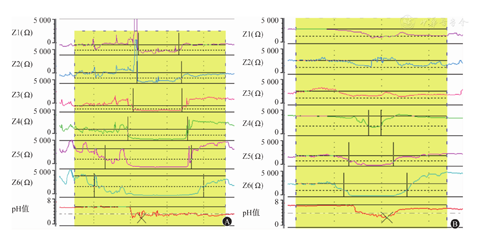 (1)PSPW指数:PSPW指反流事件结束后30 s内发生的吞咽事件。反流诱发的食管原发蠕动可以促进唾液对食管远端酸化的中和。PSPW指数指伴有PSPW的反流次数占总反流次数的百分比,可反映食管的化学清除能力,是近年来被新引入用于GERD评价的参数。健康人的PSPW指数>61%;低PSPW指数可作为存在病理性反流的辅助证据[17],并可预测患者对抑酸治疗的反应[18]。