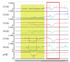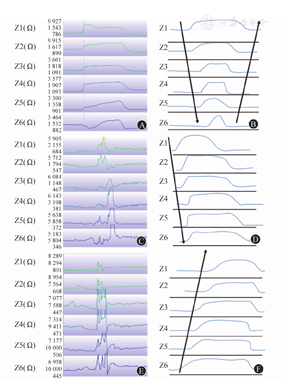 注:向下箭头表示通道阻抗值从最远端通道(Z1)至最远端通道(Z6)出现顺行性改变;向上箭头表示通道阻抗值从最远端通道(Z6)至最近端通道(Z1)出现逆行性改变。因各通道阻抗值差异较大,故采用分析软件的"自动量程"功能阅片