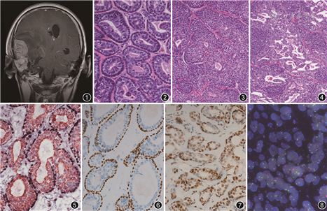 患者女,65岁。2020年5月1日因突发意识不清,就诊外院。颅脑CT显示右侧颞叶区占位性病变,右侧颞骨骨质破坏,考虑外耳道恶性肿瘤脑转移。为进一步治疗,于2020年5月7日就诊于福建医科大学附属第一医院,以“脑继发性恶性肿瘤”收入院。体检见患者右侧外耳道部分缺如。患者平素体健,高血压病史10年余。2014年8月因右外耳道肿瘤于外院行手术切除,术后病理:耵聍腺腺样囊性癌,并查见淋巴结转移。患者经根治性手术及术后规范放疗,术后恢复较好,放疗方案及疗程具体不详。本次住院颅脑磁共振成像(MRI)显示右侧颞骨乳突部-右颞部占位性病变并颞骨乳突及鳞部骨质破坏;T1和T2加权图像呈低信号,局灶T2图像呈高信号,FLAIR呈低信号,其内信号不均,增强扫描显示实性部分明显强化;病灶累及部分右侧外耳道,考虑恶性肿瘤复发播散可能,伴大脑镰下疝、颞叶钩回疝(图1)。胸部CT扫描显示双肺多发结节,考虑转移性肿瘤。患者入院完善相关检查后行右颞入路大脑深部肿瘤切除术。术中见肿瘤位于右侧颞叶区,侵犯硬脑膜及部分骨组织,肿瘤与周围脑组织边界尚清,部分与中颅底粘连紧密。为避免颅腔与内耳道沟通,手术切除大部分肿瘤及扩大剪除肿瘤周缘硬脑膜,送病理检查。临床评估双肺多发病灶及身体无法耐受等情况,未进一步手术处理,给予相应的对症治疗。