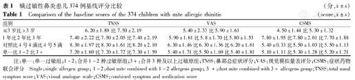 Comparison of the baseline scores of the 374 children with mite allergic rhinitis(score,