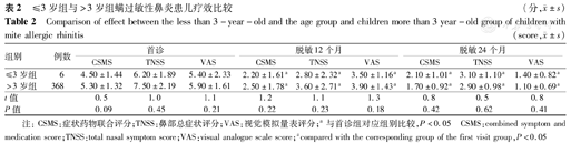 Comparison of effect between the less than 3-year-old and the age group and children more than 3 year-old group of children with mite allergic rhinitis(score,