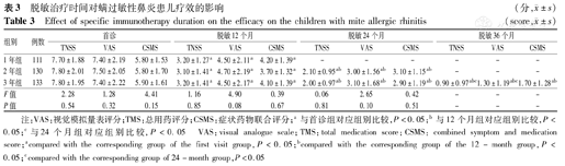 本研究针对不同疗程患儿进行分析,完成1年舌下脱敏治疗者111例(29.7%),完成2年脱敏治疗者130例(34.8%),完成3年脱敏治疗者133例(35.6%)。脱敏治疗1年、2年、3年的患儿首诊时的CSMS、TNSS及VAS评分差异均无统计学意义,表明患儿基线无差别;CSMS评分组,首诊与治疗1年、2年、3年后评分差异有统计学意义,治疗1年与治疗2年、3年差异有统计学意义;此外TNSS除了具备CSMS评分的显著性特征外,治疗2年和治疗3年评分差异仍有统计学意义;VAS评分与TNSS评分的统计学趋势相同(表3)。