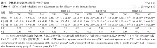 本研究对脱敏治疗6个月后,依据患儿或家长的反馈情况进行评估,对于反馈疗效尚可的患儿指导其正常使用药物;对于反馈疗效不明显,或无效的患儿,TNSS评分高于4分的患儿增至4号4滴,其中部分患儿1年评估时TNSS评分仍高于4分的患儿增至4号5滴,设为个体化调整治疗组,常规用药发挥疗效的患儿作为对照组。其中个体化剂量调整4号4滴患儿15例(4%),个体化剂量调整4号5滴患儿10例(2.7%);所有患儿在首诊时评分差异无统计学意义。脱敏治疗6个月后,对照组与个体化剂量调整组间差异有统计学意义,表明对照组脱敏治疗开始发挥疗效,但个体化剂量调整组脱敏治疗疗效尚未显现;此时对个体化剂量调整组的患儿增加剂量,再经过6个月治疗后(即脱敏治疗12个月),评估其CSMS、TNSS及VAS评分,与对照组比较差异无统计学意义,表明个体化增量对前期脱敏治疗无效的患儿开始发挥疗效;但增至4号4滴的患儿在脱敏治疗12个月及24个月后,TNSS评分差异有统计学意义(表4)。
