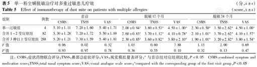 本研究针对单一螨致敏和多重致敏患儿进行分组,其中单一螨虫过敏患儿4例(1%),除螨虫外合并其他1~2种变应原的患儿82例(21.9%),除螨虫外合并其他3种及以上变应原患儿288例(77%)。患儿在首诊时评分差异均无统计学意义,但CSMA、TNSS和VAS评分,在经过12个月脱敏治疗后,首诊与12个月治疗组间差异有统计学意义,表明脱敏治疗发挥疗效;CSMS评分和VAS评分,治疗12个月,合并3种及以上其他变应原组与单一螨虫过敏组间差异有统计学意义,治疗24个月后评分组间差异无统计学意义(表5)。