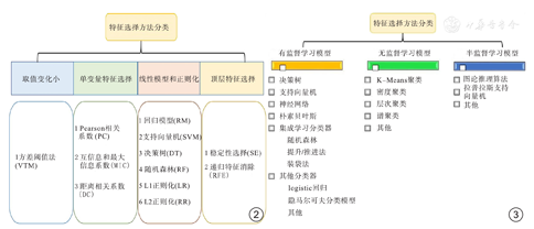 特征选择是在大量可能存在的影像组学特征数据集下驱动的;为了实现模型的完整性、应用性,还应考虑影像组学之外的特征,如临床记录数据、治疗过程中所获得的生物学如基因数据等[12]。特征选择不经过变换,直接从原始特征集中选择目标特征。根据算法过滤器数量、特征类别和其他可调参数,选择的影像组学特征数量可以无限多[12]。但一个模型若包含所有可能的特征,无疑会导致过拟合问题。因此,对特征进行预处理,消除对变量源表现不稳健特征、特征间高度相关的特征,并结合降维技术,选出可重复性好、信息量大且无冗余的特征,可有效避免过拟合问题的产生。数据分析过程中,针对原始特征,可采用方差阈值法剔除变化范围小的特征;针对单个特征与自变量的关系,可采用Pearson相关系数、互信息和最大信息系数等方法,按照某一阈值进行特征筛选;针对特征与自变量的函数式关系,可采用回归模型与非回归模型进行特征降维;也可以采用反复构建模型的方式,最终选出最优的特征,如递归特征消除法。见图2。