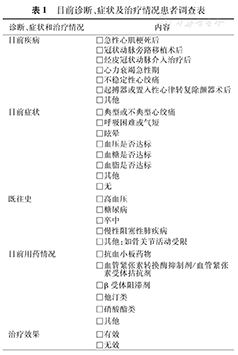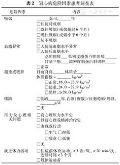 进一步明确冠心病的诊断,了解患者目前症状及药物治疗情况(表1);明确冠心病的危险因素(表2),制定干预计划。