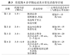 目的是帮助患者恢复体力及日常生活能力,出院时达到生活基本自理。早期运动康复计划因人而异,病情重、预后差的患者运动康复的进展宜缓慢,反之,可适度加快进程。一般来说,患者一旦脱离急性危险期,病情处于稳定状态,运动康复即可开始。参考标准:(1)过去8 h内无新发或再发胸痛;(2)心肌损伤标志物水平[肌酸激酶(CK)-MB和肌钙蛋白]没有进一步升高;(3)无明显心力衰竭失代偿征兆(静息时呼吸困难伴湿性啰音);(4)过去8 h内无新发严重心律失常或心电图改变。通常康复干预于入院24 h内开始,如果病情不稳定,应延迟至3~7 d以后酌情进行。运动康复应循序渐进,从被动运动开始,逐步过渡到坐位、坐位双脚悬吊在床边、床旁站立、床旁行走,病室内步行以及上1层楼梯或固定踏车训练(早期运动康复及日常生活指导计划示例,表3)。这个时期患者运动康复和恢复日常活动的指导必须在心电和血压监护下进行(推荐使用遥测运动心电监护系统,每个分机的显示屏具备独立的心率、心律及心电图显示,方便患者活动及医护人员监护),运动量宜控制在较静息心率增加20次/min左右,同时患者感觉不大费力(Borg评分<12)。如果运动或日常活动后心率增加大于20次/min,患者感觉费力,宜减少运动量或日常活动。另外需指出,CABG患者术后需进行呼吸训练,用力咳嗽,促进排痰,预防肺部感染。应在术前教会患者呼吸训练方法,避免患者术后因伤口疼痛影响运动训练效果。为防止用力咳嗽时,手术伤口震裂,可让患者手持定制的小枕头,保护伤口。