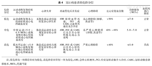 综合患者既往史、本次发病情况、冠心病的危险因素、平常的生活方式和运动习惯以及常规辅助检查,如心肌损伤标志物、超声心动图(判断有无心脏扩大、左心室射血分数)、运动负荷试验以及心理评估等对患者进行评定及危险分层(表4)。