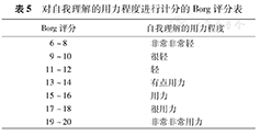 常用的确定运动强度的方法有:心率储备法、无氧阈法、目标心率法、自我感知劳累程度分级法。其中,前三种方法需心电图负荷试验或心肺运动负荷试验获得相关参数。推荐联合应用上述方法,尤其是应结合自我感知劳累程度分级法。①心率储备法:此法不受药物(β受体阻滞剂等)的影响,临床上最常用,方法如下:目标心率=(最大心率-静息心率)×运动强度%+静息心率。例如,患者最大心率160次/min,静息心率70次/min,选择的运动强度为60%,目标心率=(160-70)×60%+70=124次/min。②无氧阈法:无氧阈水平相当于最大摄氧量的60%左右,此水平的运动是冠心病患者最佳运动强度,此参数需通过运动心肺试验或血乳酸阈值获得,需一定设备和熟练的技术人员。③目标心率法:在静息心率的基础上增加20~30次/min,体能差的增加20次/min,体能好的增加30次/min。此方法简单方便,但欠精确。④自我感知劳累程度分级法:多采用Borg评分表(6~20分),通常建议患者在12~16分范围内运动(表5)。
