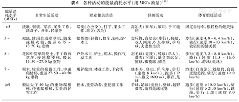 | 能量消耗水平(METs) | 日常生活活动 | 职业相关活动 | 休闲活动 | 体育锻炼活动 |