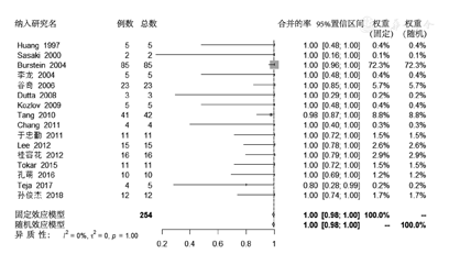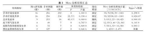 | 手术疗效有效率 | 16 | 254 | 252 | 0 | 1.000 0 | 固定 | 99.76(98.39~100) | 0.298 8 |