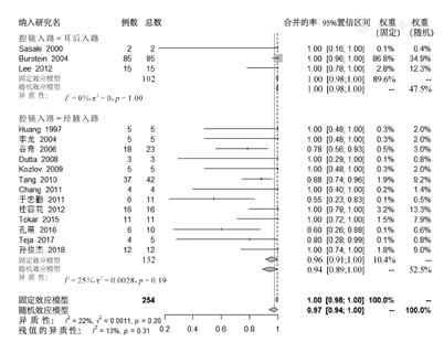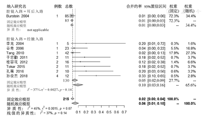 按"腔镜入路"的不同,可将16项研究划分为"耳后入路"和"经腋入路"2个亚组,对手术疗效优秀率行亚组分析提示二者异质性检验结果分别为I2=0和I2=25%,说明二者均没有明显的异质性;将两亚组合并则I2=22%,提示研究类型不同并非异质性来源;亚组间比较,差异无统计学意义(P=0.070 5,图3);总并发症率行亚组分析提示两亚组合并后I2增加,提示腔镜入路不同可能是异质性的来源之一,亚组间比较,差异无统计学意义(P=0.062 4,图4)。