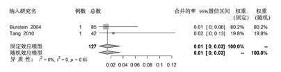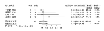 | 皮下积气发生率 | 4 | 49 | 7 | 0 | 0.747 5 | 固定 | 12.65(3.46~21.84) | 0.141 8 |