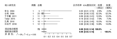 | 皮肤灼伤和瘀斑发生率 | 6 | 72 | 7 | 0 | 0.849 8 | 固定 | 7.55(1.53~13.58) | 0.003 3 |
