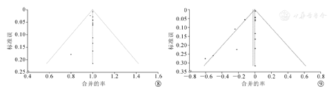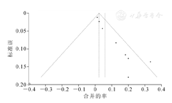 我们对纳入研究数>9篇文献的3项结局指标进行漏斗图分析其发表偏倚情况,结果提示手术疗效有效率漏斗图对称性较好,其结果受发表偏倚影响可能性较小(图8);手术疗效优秀率和总并发症率漏斗图对称性欠佳,存在发表偏倚的可能性(图9,图10)。