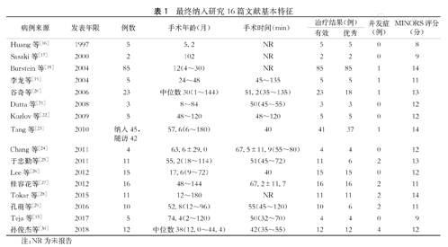 | 病例来源 | 发表年限 | 例数 | 手术年龄(月) | 手术时间(min) | 治疗结果(例) | 并发症(例) | MINORS评分(分) | |