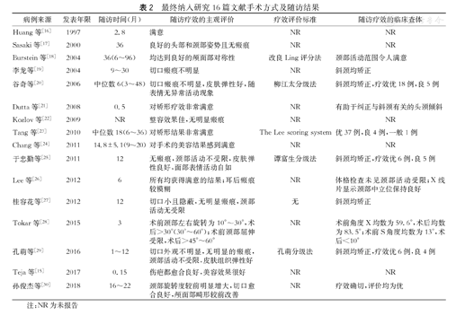 | 孙俊杰等[30] | 2018 | 16~22 | 颈部旋转度较前明显增大,切口愈合良好,颅面部畸形较前改善 | NR | 疗效确切,评价均为优 |