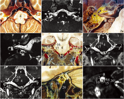 1前庭蜗神经 2面神经 3桥小脑角池 4脑桥 5展神经 6耳蜗 7小脑绒球 8乳突 9内耳道 10蜗神经 11前庭神经 12半规管 13鼓室 14前庭上神经 15前庭下神经 16滑车神经 17三叉神经 18椎动脉 19颈内动脉 20颈内静脉