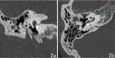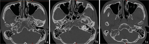 先在颞骨轴位层面准确定位解剖位置恒定的棘孔位置(图1a),作一条过棘孔中点的水平线,确定为过棘孔中点的冠状面。保持这条水平线不变,寻找面神经垂直段的起点(第二膝末端)和终点(茎乳孔层面)。在面神经垂直段起点和终点层面,分别测量面神经垂直段至棘孔及面神经至乳突的距离(图1b、图1c)。测量数据分别可以准确反映面神经前、后方向的位移改变。颞骨轴位层面上,准确定位面神经垂直段起点和终点后(图1b、图1c),在这两个层面,分别作一条过乳突最凸点的前后方向切线,测量面神经垂直段至过乳突切线的距离。这个距离可以一定程度反映面神经垂直段是否外移。