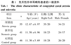 本研究为回顾性分析。收集2008年1月~2012年12月就诊的71例先天性外中耳畸形患者的颞骨CT影像资料,共142耳。男性42例,女性29例,平均年龄11.9岁。入组标准为:临床诊断为先天性外中耳畸形患儿,颞骨高分辨率CT检查资料完备,无中耳炎病史或是其它中耳乳突病变,无外中耳手术史。外耳道闭锁定义为先天性外耳道的完全骨性闭锁,本组55耳,归入闭锁组;外耳道狭窄定义为骨性外耳道最宽处直径小于4 mm,包括外耳道的膜性闭锁或伴胆脂瘤,涉及鼓室的除外,本组41耳,归入狭窄组;对照组46耳,均为患者的正常对侧耳。3组一般情况见表1。