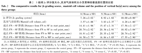 3组间Js评分、乳突气房容积及面神经垂直段位置两两比较,除了乳突气房容积外,其余各参数之间差异均有统计学意义(P<0.05),见表2、表3。