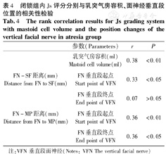 Spearman秩相关检验发现,闭锁组与狭窄组内Js评分与乳突气房容积、面神经至棘孔、乳突的距离成正相关。见表4、表5。