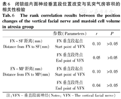 Spearman秩相关检验发现,闭锁组与狭窄组内乳突气房容积与面神经垂直段至过棘孔冠状面、乳突切线距离成正相关,即乳突气化越好,面神经至棘孔、乳突切线距离越大。见表6、表7。