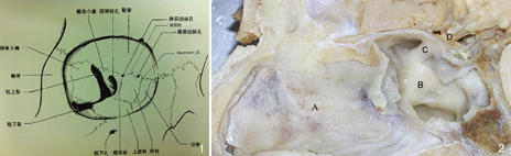 眶内侧壁是由上颌骨额突、泪骨、筛骨眶板、额骨和蝶骨体等组成,处于鼻、眼及前颅底的交界。其外侧有走行多变的筛血管神经丛和内直肌,内侧构成筛、蝶窦的外侧壁,上与前颅底接近,后紧邻视神经。这种特殊的解剖结构,为经鼻外筛窦进路视神经管减压手术提供了解剖学依据,同时也决定了此区域又是并发症好发部位。因此,寻找恒定的术中容易辨认的解剖标志,是保证手术顺利进行和避免并发症发生的关键。Dacryon’s点和额筛缝是眶内侧壁上两个较为恒定的解剖标志(图1)。Dacryon’s点位置表浅,术中容易分辨。我们曾对15具(30侧)头颅标本的眶内侧壁进行观测,测量Dacryon’s点至筛前、中、后孔中点及视神经管眶口的距离分别为(19.3±1.4)mm、(27.1±2.1)mm、(31.1±2.1)mm和(37.5±2.1)mm。筛前、中、后孔沿着额筛缝排列,关系恒定。筛前、中、后孔最常见位于额筛缝,分别占60%、66.7%和64.3%;其次位于额筛缝上方,分别占37.5%、33.3%和35.7%,30侧中,只有一侧筛前孔位于额筛缝下方。这些发现对术中筛动脉及视神经管眶口的定位有重要的指导意义。另外,Dacryon’s点与筛孔、视神经管眶口并非在同一水平面,而是呈略微向外上隆起的弧形,因此,在鼻外筛窦进路行视神经管减压术时可以Dacryon’s点为标志[1]。