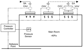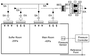 In the main room, the air supply volume is constant, and the air exhaust volume is variably. A constant air supply volume ensures that the air exchange rate of the workshop meets the requirements of design. The variable air volume valve (VAV) installed in the room exhaust duct is adjusted according to the room pressure to meet the pressure requirements in the room.