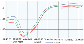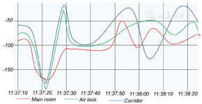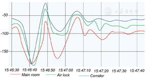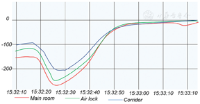 Fig. 6 shows the secondary test results after a period of debugging and rectification. It can be seen from the curve that, through the precise debugging of the frequency conversion rate of the air supply and exhaust fans after switching, the room pressure returned to close original value after the system is switched and pressure gradient can basically meet the standards and usage requirements.