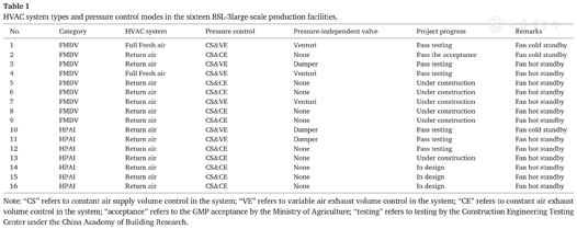 HVAC system types and pressure control modes in the sixteen BSL-3large-scale production facilities.