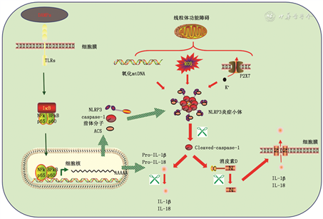 注:DAMPs为损伤相关分子模式;TLRs为Toll样受体;NLRP3为核苷酸寡聚化结构域样受体家族3;mtDNA为线粒体DNA;IL为白细胞介素;caspase为半胱天冬酶; ROS为活性氧;ASC为凋亡相关斑点样蛋白