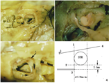 锯开颅盖,去除脑组织,剥离颅中窝底硬脑膜,暴露弓状隆起、岩浅大神经、脑膜中动脉和棘孔等重要手术标志。(1)按文献[2,3]报道的方法,完成咽鼓管成形术的手术全过程。切除鼓室盖及咽鼓管骨部顶壁骨质,从上方暴露上鼓室、中耳腔、咽鼓管骨部、膝状神经节及面神经。然后针对proctor提出的STR进行解剖学观测,包括STR大小,STR解剖界限,STR的定位,STR与咽鼓管骨部和上鼓室的解剖关系,膝状神经节、面神经与STR的解剖关系,鼓膜前上缘、鼓口平面以及STR三者的解剖关系。(2)按颅中窝手术的方法固定标本,颞部开骨窗。以研究的定位方法进行开放STR的手术模拟操作,进一步验证此定位方法的准确性及循STR开放咽鼓管骨部的可行性,包括存在的问题及解决的办法。