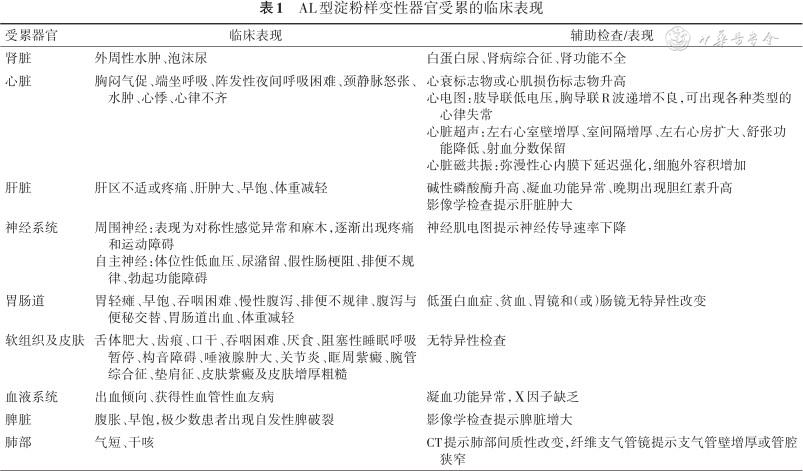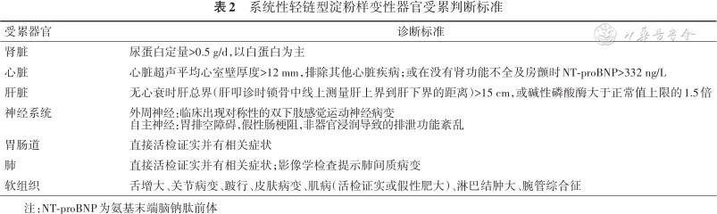 推荐使用表2的标准判断AL型淀粉样变性患者的器官受累。确诊AL型淀粉样变性后,可综合临床、组织学和影像学特征判断患者全身各器官受累情况。